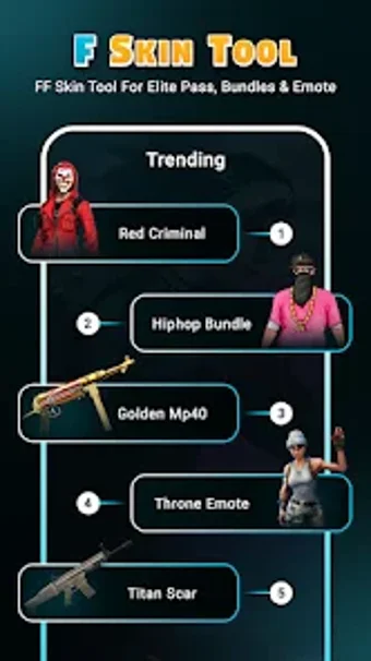 FFF FF Skin Tool Elite Pass is een gebruiksvriendelijke applicatie voor Android die gebruikers in staat stelt om populaire skins, emotes en Elite Pass Bundels te verkrijgen voor hun favoriete battle royale games. Met een breed scala aan functies, zoals legendarische wapenskins, zeldzame emotes, en voertuigskins, biedt deze tool een leuke manier om je spelervaring te verbeteren. De app stelt spelers in staat om hun personages te personaliseren met trending skins en unieke outfits.